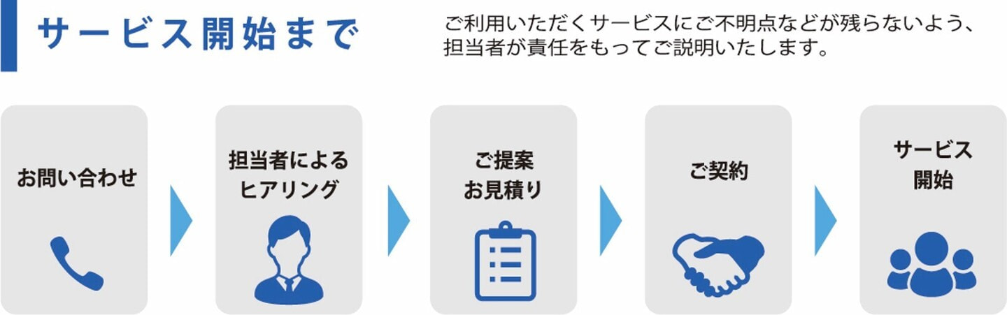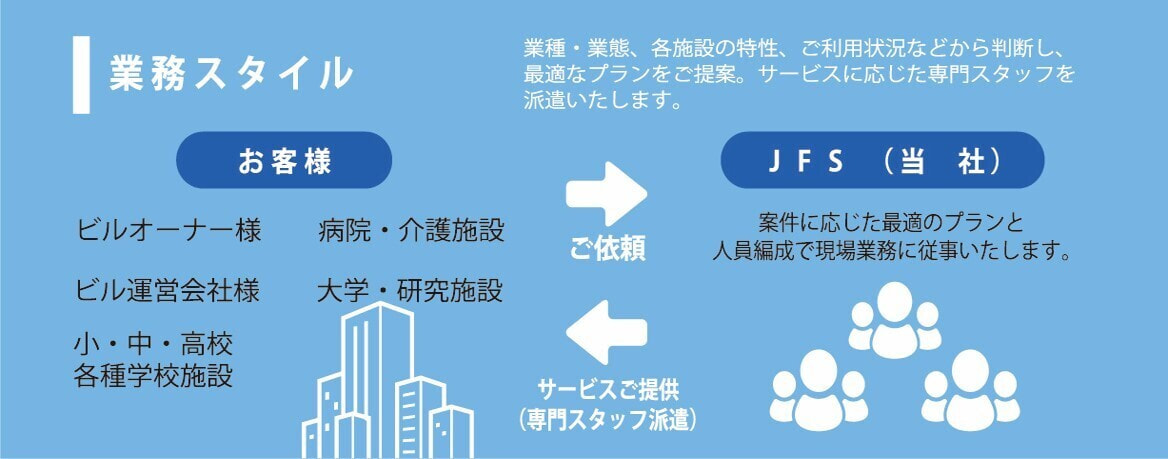 当社では、設備・建物について業種業態から特性を把握し、現状診断、精査を行い、最適な仕様をご提案いたします。そのうえで必要に応じた専門のスタッフを配置致します。